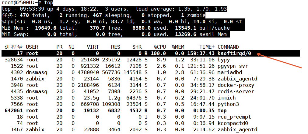 PID 为 17的名为 ksoftirqd/0 的进程 CPU 使用率达到了100%